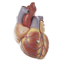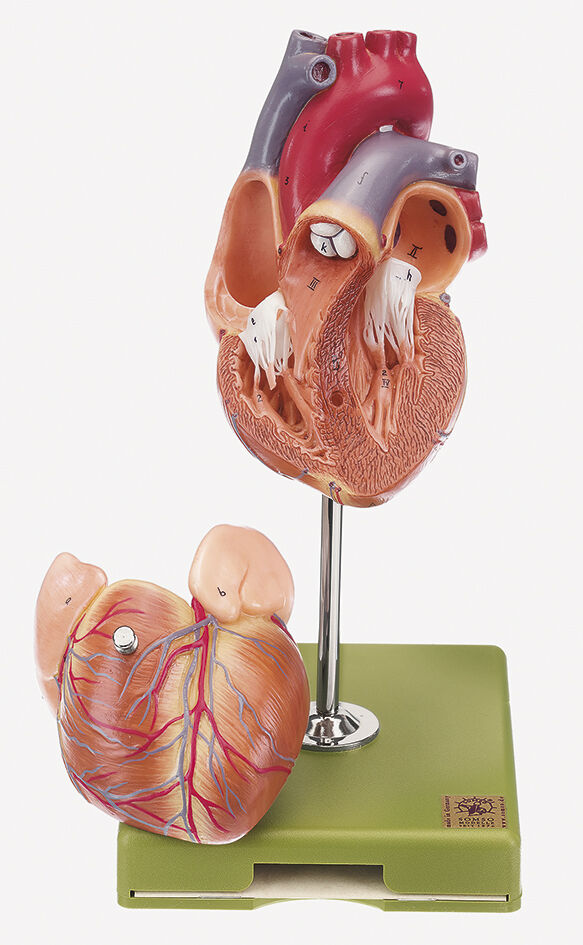 The semilunar and sigmoid valves are shown. Separates into 2 parts, on a stand and green base.