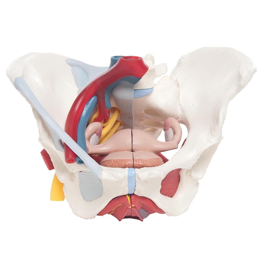 - Life-size human female pelvis model for anatomical study of female pelvic bones, ligaments, vessels, nerves, muscles, and organs
