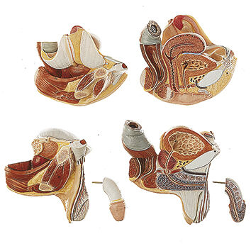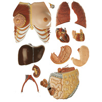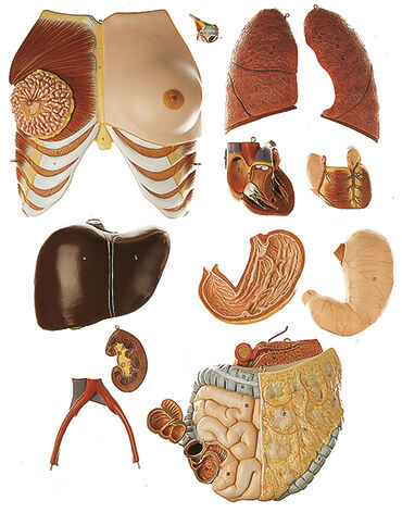 Separates into 20 parts: eye with optic nerve and muscles, female thoracic wall, halves of the lung (2 parts), heart (2 parts), liver, stomach (2 parts), small and large intestine with duodenum and pancreas, opening appendix, right kidney, pelvic vessels, female (2 parts) and male (4 parts) reproductive organs, torso. On a green base.