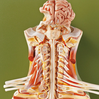 The model shows the brain stem and the spinal cord, as well as the nerve branches, up to the coccygeal plexus. On the left side, the sympathetic trunk with its connections to the central nervous system is shown. In one piece. Mounted on a green board.