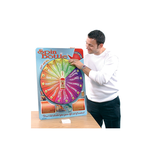 "Spin the Bottle" to demonstrate the effects of alcohol on a drinker's life. These consequences become clear when the player lands on a variety of outcomes associated with alcohol abuse. This alcohol education game includes a fake bottle of whiskey on the wheel, demonstration notes and demonstration cards.