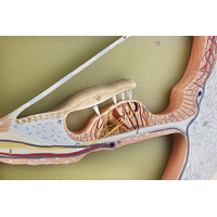 The scala vestibuli, the scala tympani, the cochlear duct with tectorial membrane, and the organ of Corti are shown. Cannot be disassembled. On a green board.