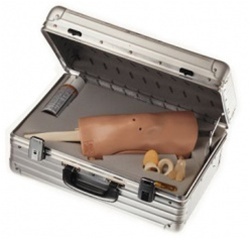 The ligamentous apparatus i.e. the lateral ligaments and the cruciate ligaments are represented nearly true-to-nature. An easy exchange of the ligaments is possible because of the screw and plug-in joints. The patellar ligament is shown and the patella can be exchanged. After removal of the cutaneous-muscular covers one can use the bones with the ligaments as a functional knee-joint model. The mounting support at the thigh is suitable for mounting in an operating vice. The cutaneous and muscular covers are kept in place by four synthetic screws. In an aluminium suitcase.