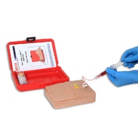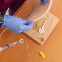 The underlying soft tissue block of this model permits the port to “float” when palpating through the skin flap, for a truly realistic port access experience. Accessing can be taught and practiced with the tissue pad in the case or removed from the case. This port training model is a great tool for the learning and practicing of palpating and accessing IVAD, competency testing, and skills assessment!