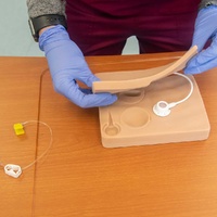 This healthcare simulation model is supplied with a real port and it’s possible to simulate accessing the following IVAD placements: normal, “tipping”, “wandering”, and deeply placed. Successful access is confirmed by a simulated blood return, as the model has its own 35cc simulated blood reservoir bag neatly tucked inside it. The two round inserts, used to simulate the “wandering” and “tipping” port, are interchangeable to vary the experience. The tissue flap that is placed over the port has two thicknesses – the 1/4″ side will approximate the feel when palpating a port at an average depth, while the 1/2″ side will approximate the feel when palpating a deeply placed port during simulation.