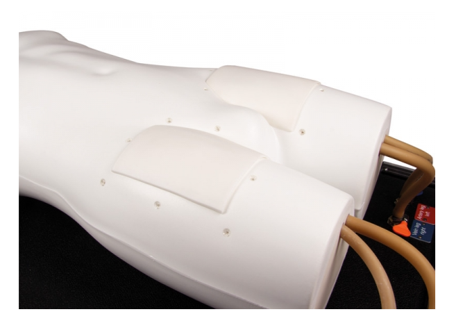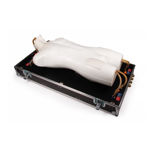 This training model features an arterial and venous circulation, both operated with automated pumps which can be adjusted in flow volume and pulsating rate. A real patient can be simulated with all possible conditions that may happen during the procedure. The model is suitable for VA- and VV-ECMO. The puncture and cannulation can be practiced using real materials and instruments. The arteries do have a lumen of 8 mm, the veins of 10 mm. This allows the use of common catheter types without any problems. The puncture pads (one each at left and right femoral puncture site and one at the jugular puncture site) are made of ultrasound capable material. This allows ultrasound control of the needle until it reaches the vessel tube. The Trainer can be used with a real ECMO machine and provides realistic fluid volume for realistic operation of the machine. The trainer also has contact points for 4-lead ECG. The contact points can be connected to a ECG simulator (not included). The veins also do have connectors for flow rate measurement.