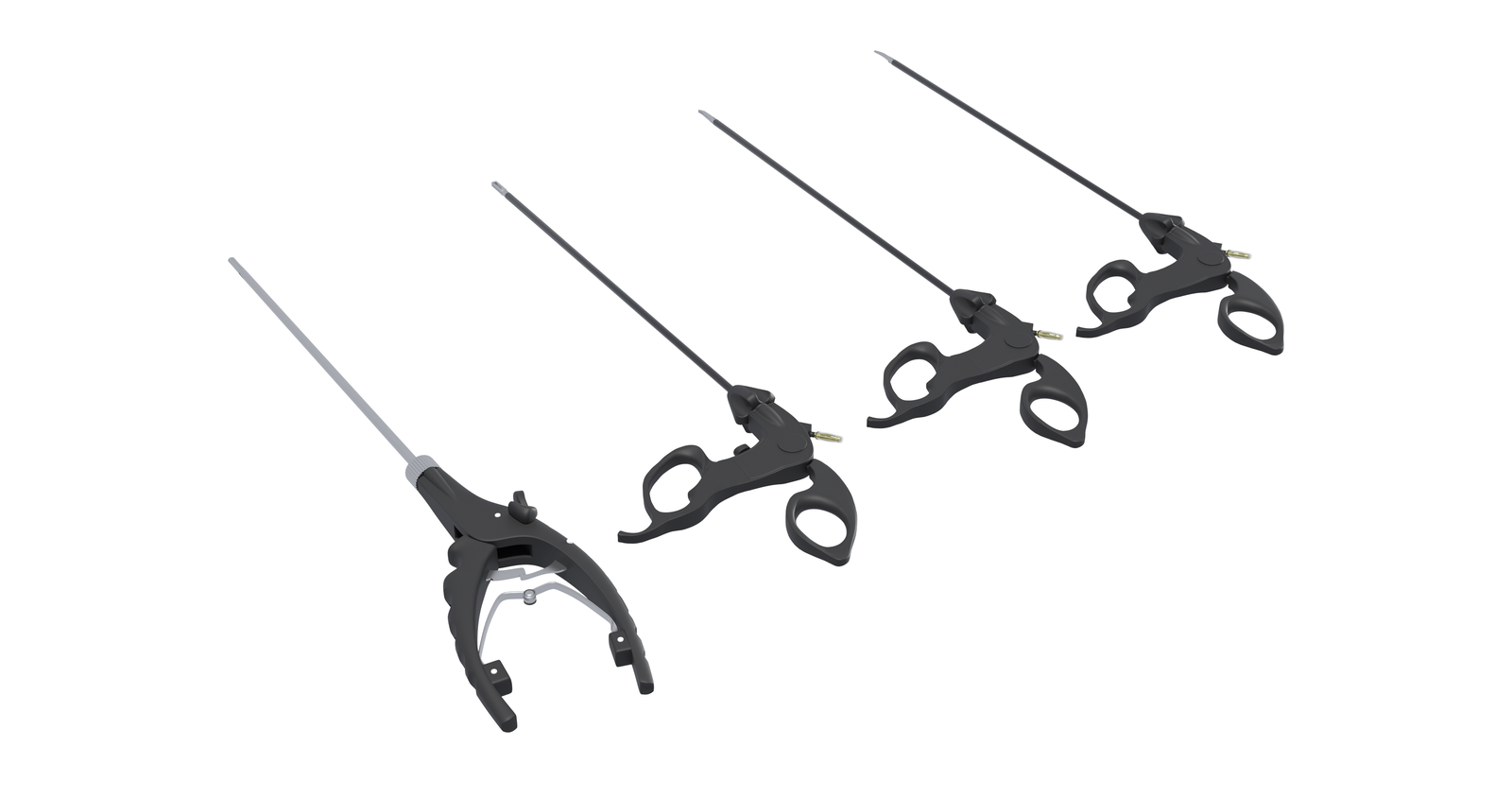 - 4 laparoscopic instruments: 1x needle holder, 1x scissors, 1x Maryland, 1x ratcheted Johans