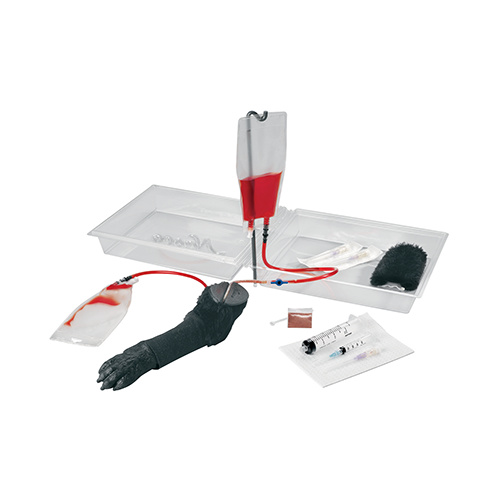 The trainer represents the left foreleg of a medium-sized dog in the Sternal recumbent position, and features two interchangeable sleeves - normal fare for routine blood draws, and a “shaved” area for IV catheter insertion. Great for bandaging and restraint/assistance practice as well. Includes a portable storage box with built-in IV pole, blood powder, syringe, IV catheter, and two fluid supply bags.